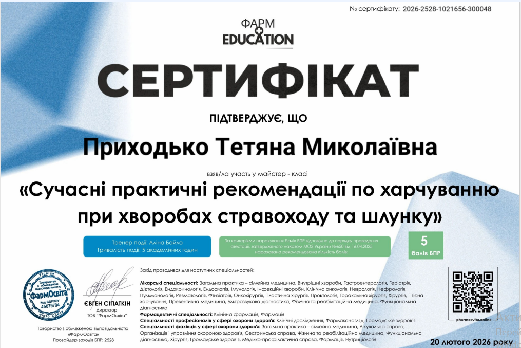 Паспорт сертифікату дієтології та нутриціології для Тетяни Миколаївни Приходько.